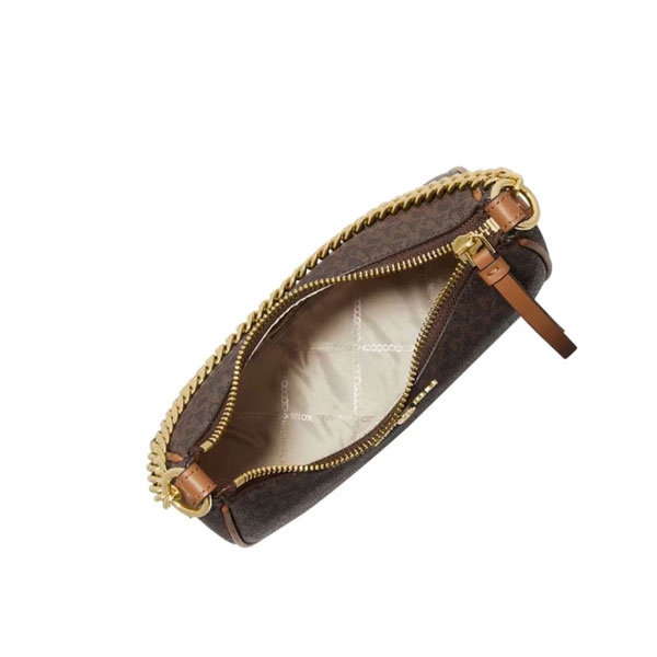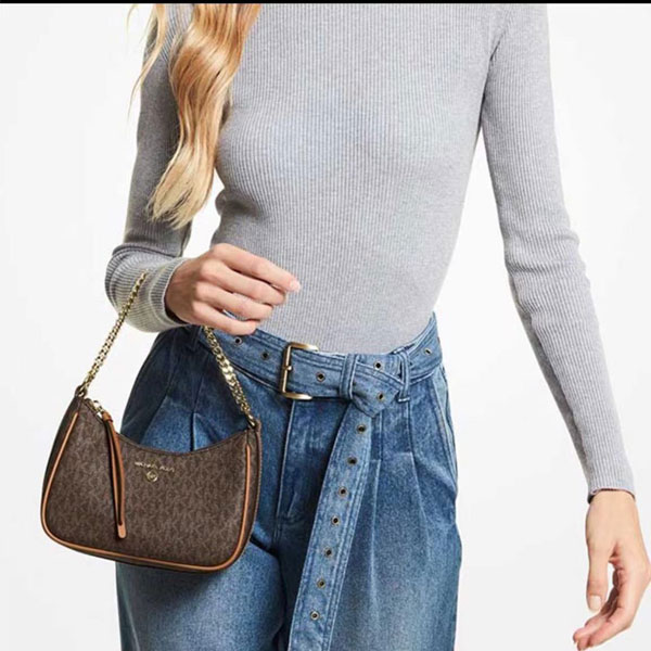 此款 Michael Kors Jet Set Charm 大號老花單肩包,採用棕色品牌標誌性 Logo 印花打造時下流行的小巧腋下包造型,上綴低調MK Logo金屬件,細節處彰顯品牌質感。mk 單肩包設有金屬鏈條與拼接短肩帶,集潮流與實用為一體。