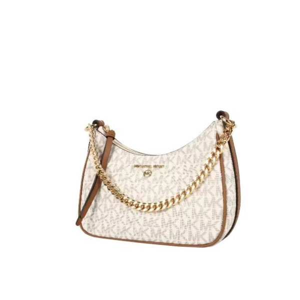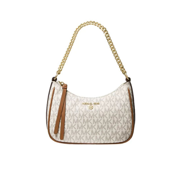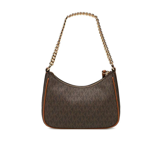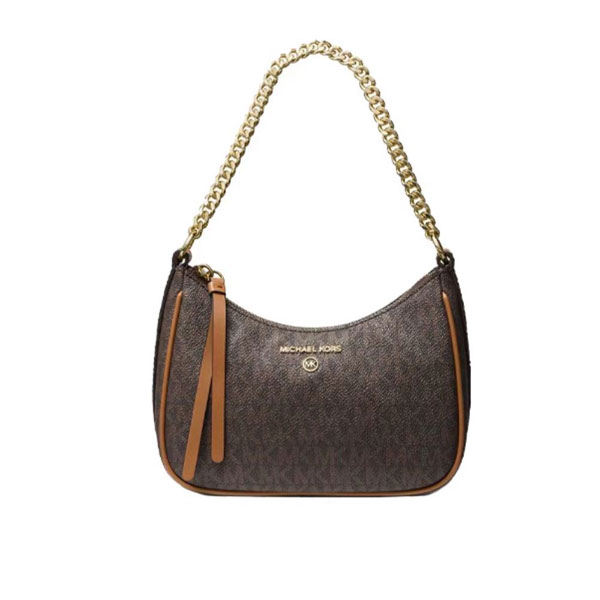 此款 Michael Kors Jet Set Charm 大號老花單肩包,採用棕色品牌標誌性 Logo 印花打造時下流行的小巧腋下包造型,上綴低調MK Logo金屬件,細節處彰顯品牌質感。mk 單肩包設有金屬鏈條與拼接短肩帶,集潮流與實用為一體。