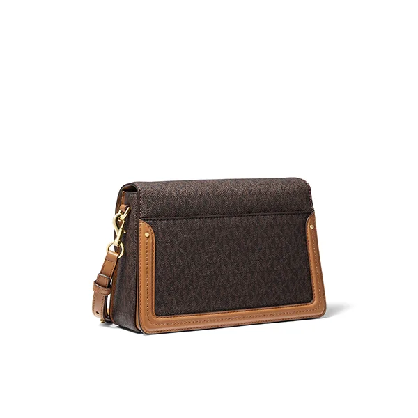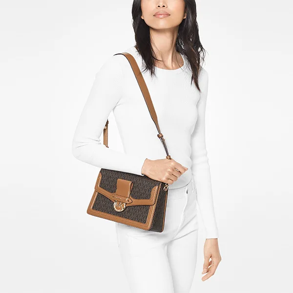 此款 Michael Kors Jessie 單肩包優雅翻蓋造型優雅別緻。飾有標誌性雙色品牌 Logo 印花,磁吸搭扣搭配品牌 Logo 金屬吊墜,造型奪目。mk 側背包內側隔層寬敞,後口袋設計方便實用,為日常用品收納提供更多空間。mk 斜肩包適中的肩帶設計讓您在攜帶使用時,減輕肩部壓力。