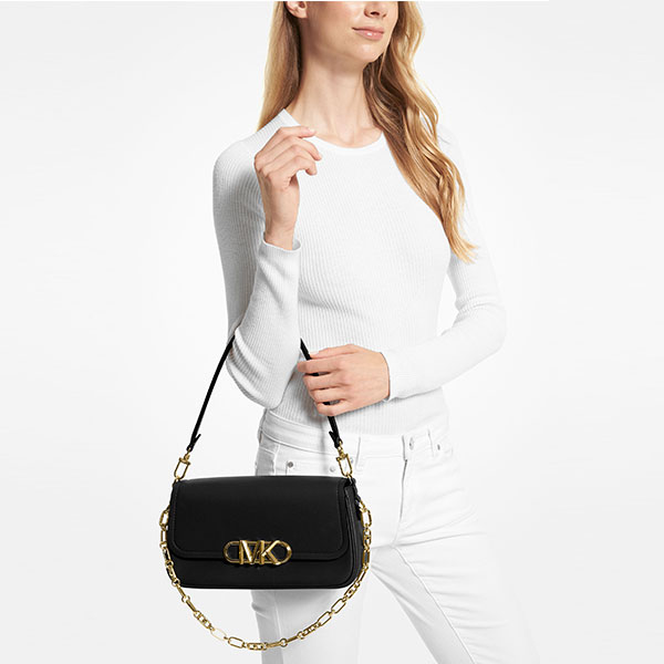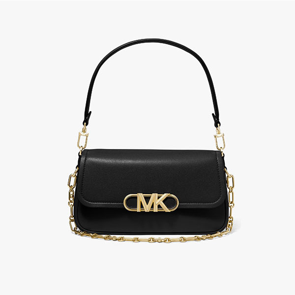 此款Michael Kors Parker 中號單肩包,簡約廓形,選用全新升級的金色 MK Logo 金屬件封存優雅氣質,細節處彰顯品牌質感。mk 單肩包採用經典純黑色皮革打造包身,包蓋邊緣採用純白色皮革鎖邊,翻蓋設計,內部空間充裕。單品設有鏈條和短皮革雙肩帶,彰顯不俗潮流品味
