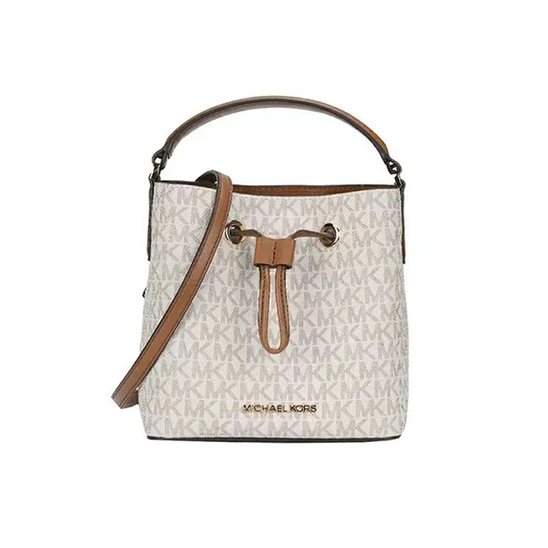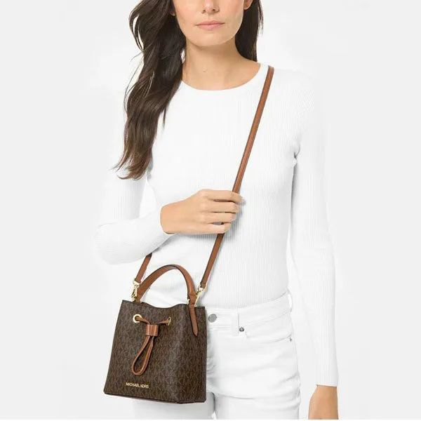 此款Michael Kors Suri是經典迷你水桶包系列,採用浮雕金屬LOGO與滿版LOGO印花PVC拼接/內裡皮革,束口開口,可拆卸提手和可調節肩帶,方便實用,mk 斜肩包內可放中短夾及手機等隨身小物,是款出遊無負擔包款,若偏好實用迷你包的你,不能錯過這款。