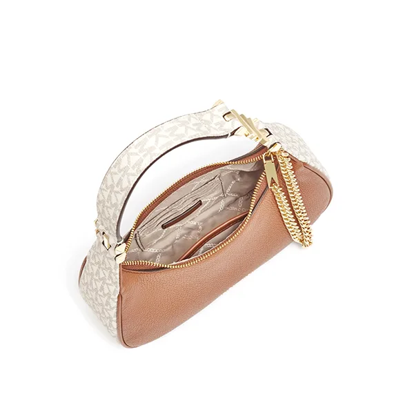 此款 Michael Kors Piper 小號老花鏈條單肩包,時下流行的腋下包造型,設有可調節純色皮革肩帶和金屬鏈條短肩帶,集潮流與實用為壹體。包身採用純棕色皮革打造,上綴低調Logo金屬件,mk單肩包側面採用白色品牌標誌線 logo 印花拼接,細節處彰顯品牌質感。