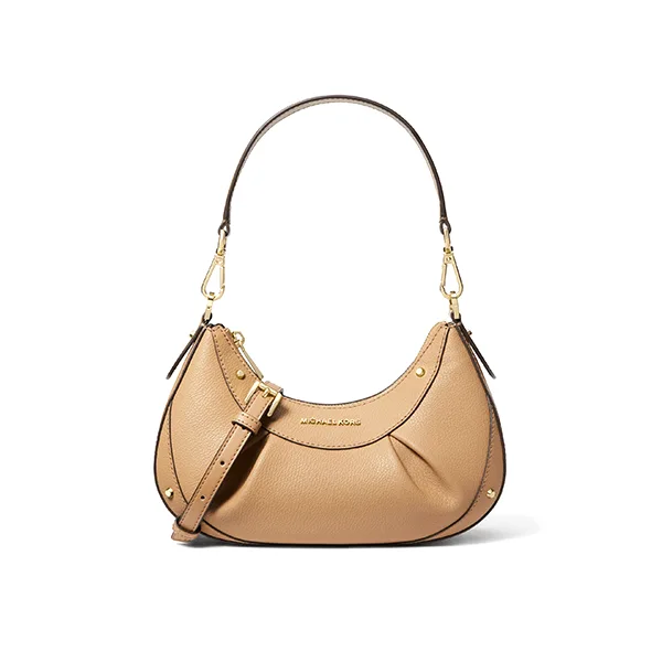 此款 Michael Kors Enzo 小號皮質斜挎包,採用優雅駝色皮革打造時下流行的豌豆包造型,設有可調節長肩帶和手提短肩帶,拉鏈開合,集潮流與實用為一體。mk 斜挎包身上綴低調 Logo 金屬件和褶襇造型,細節處彰顯品牌質感。