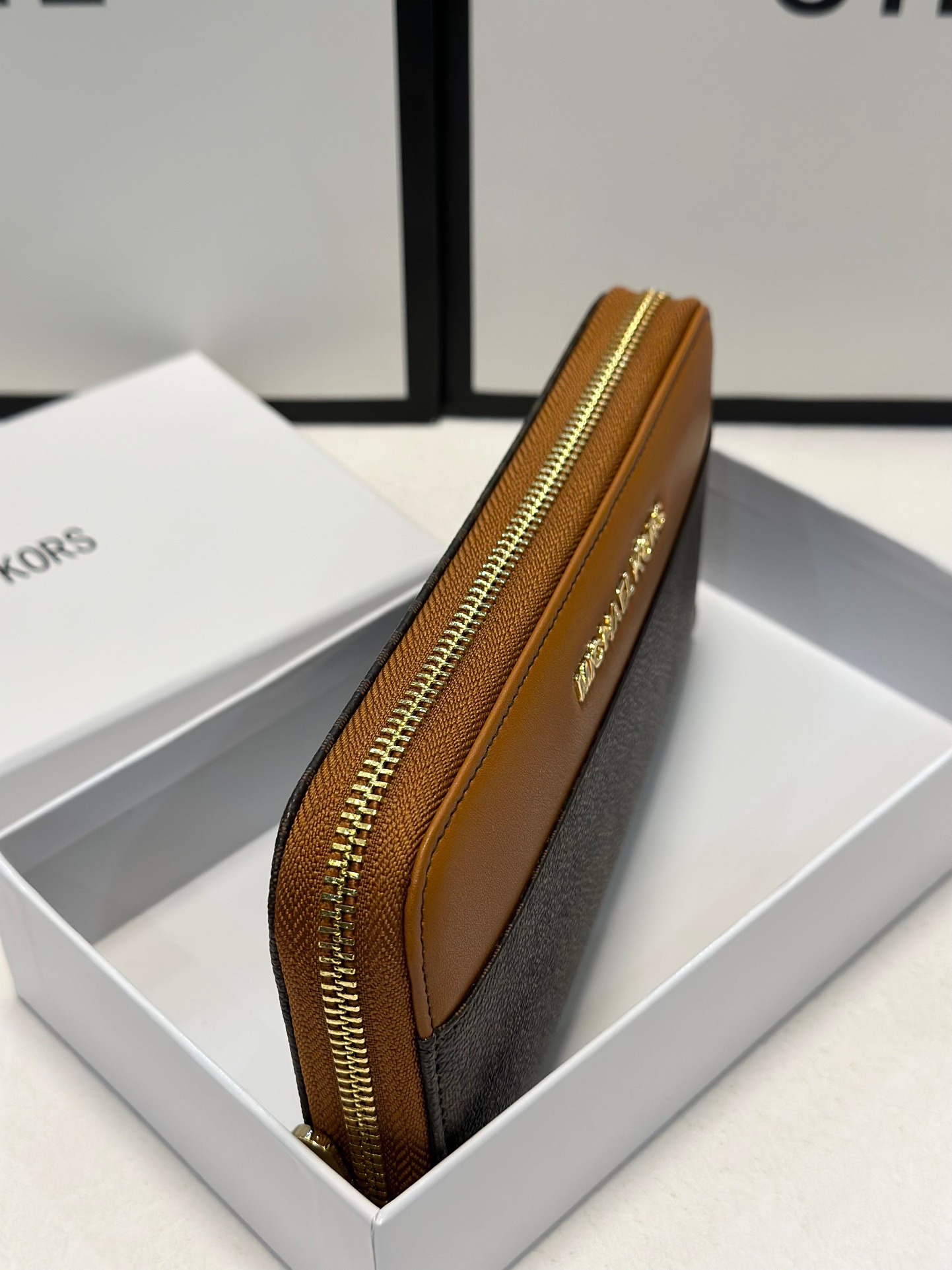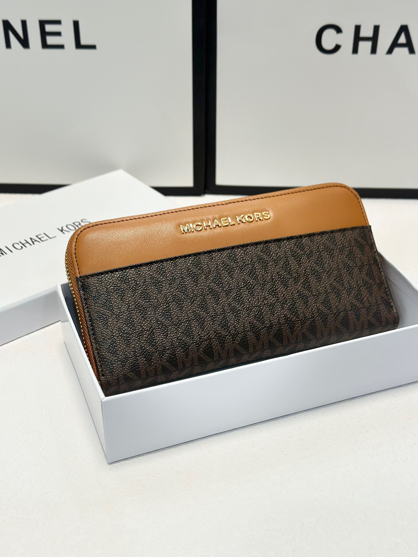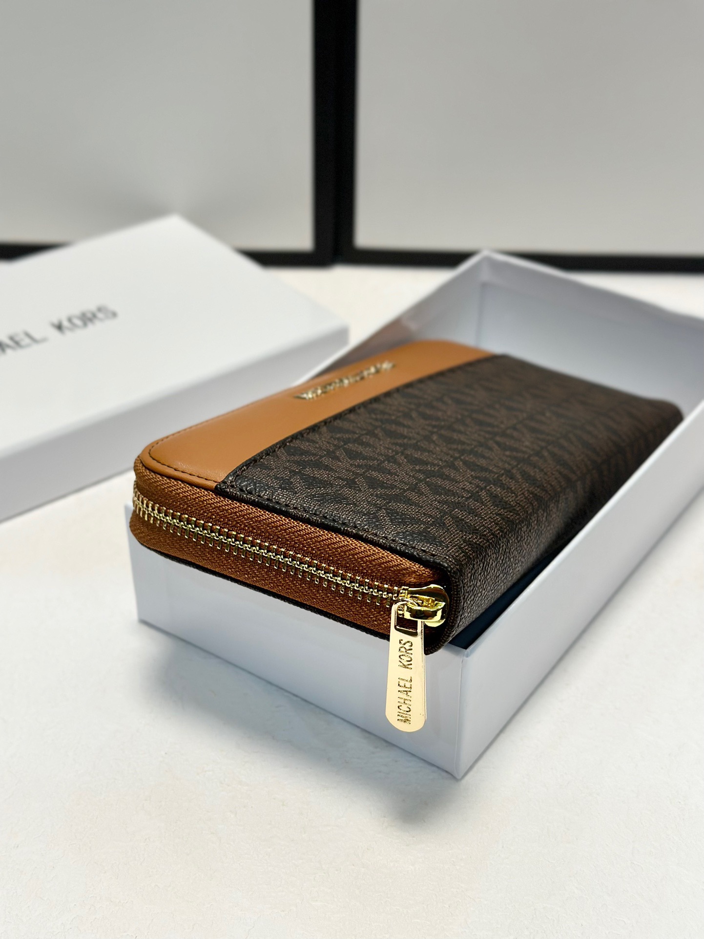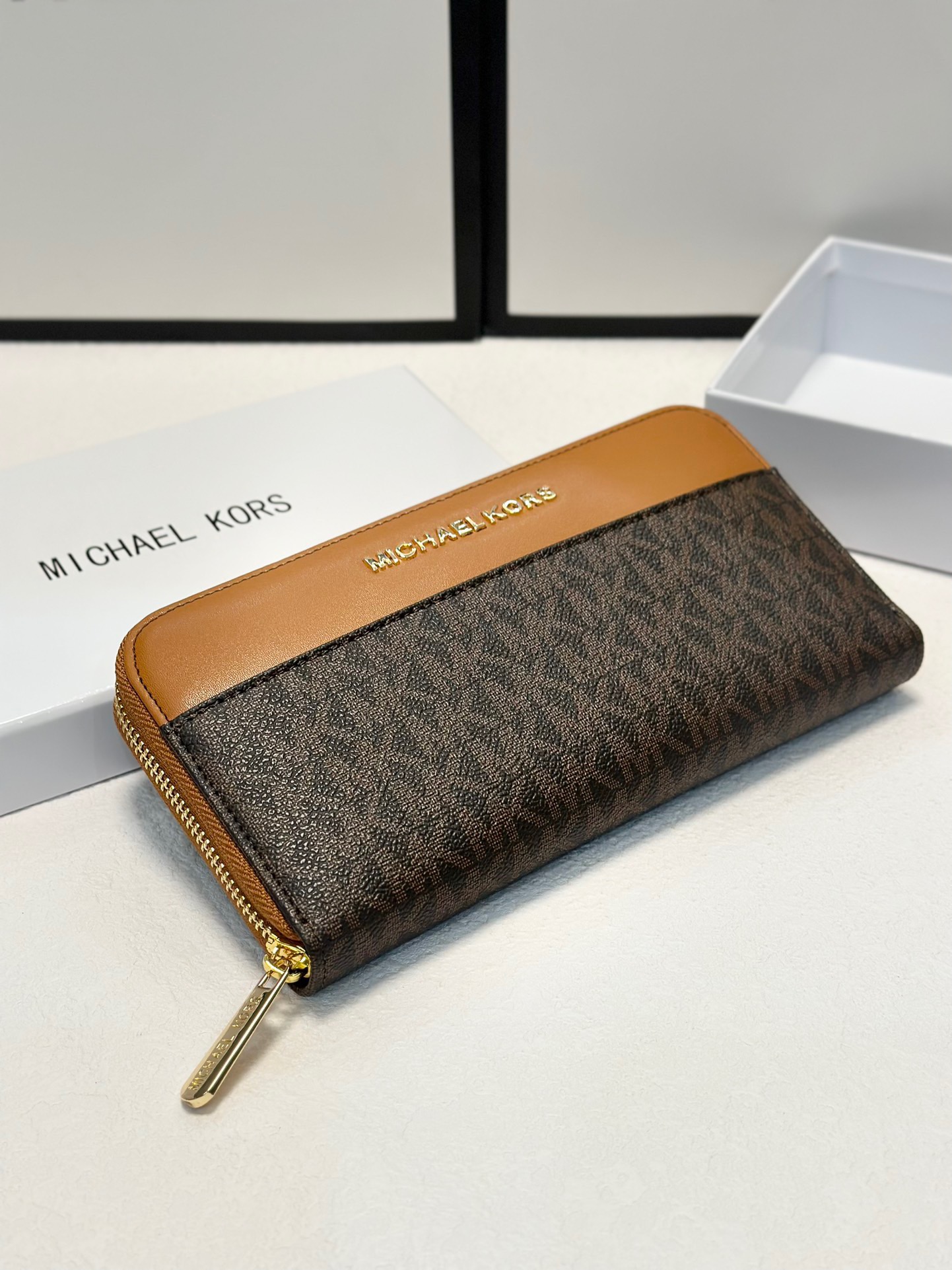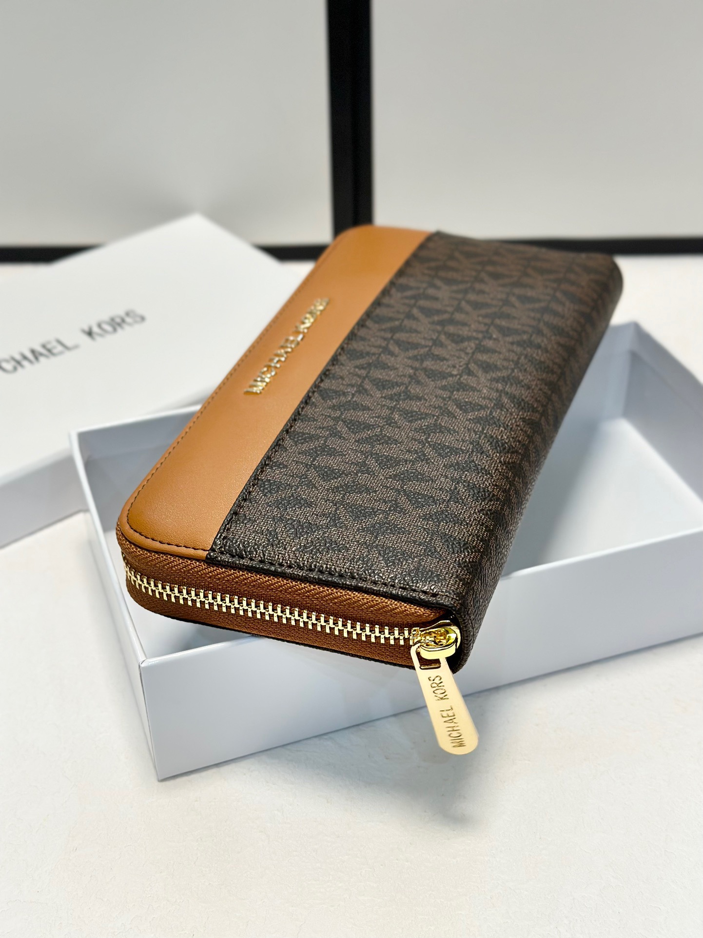 【棕拼咖色】Michael Kors MK優質牛皮手感壹流時尚設計潮版單拉鏈錢包,采用高質量牛皮材質,展現出出色的觸感和耐用性。mk 錢包設計簡潔大方,融合棕色與咖色拼接,突顯時尚氣息與經典元素。內部分隔合理,配備多個卡槽、現金隔層及硬幣袋,滿足日常收納需求。單拉鏈開合,使用方便,適合追求高品質和時尚感的消費者。設計現代、時尚,適合各類場合使用,既實用又富有設計感。